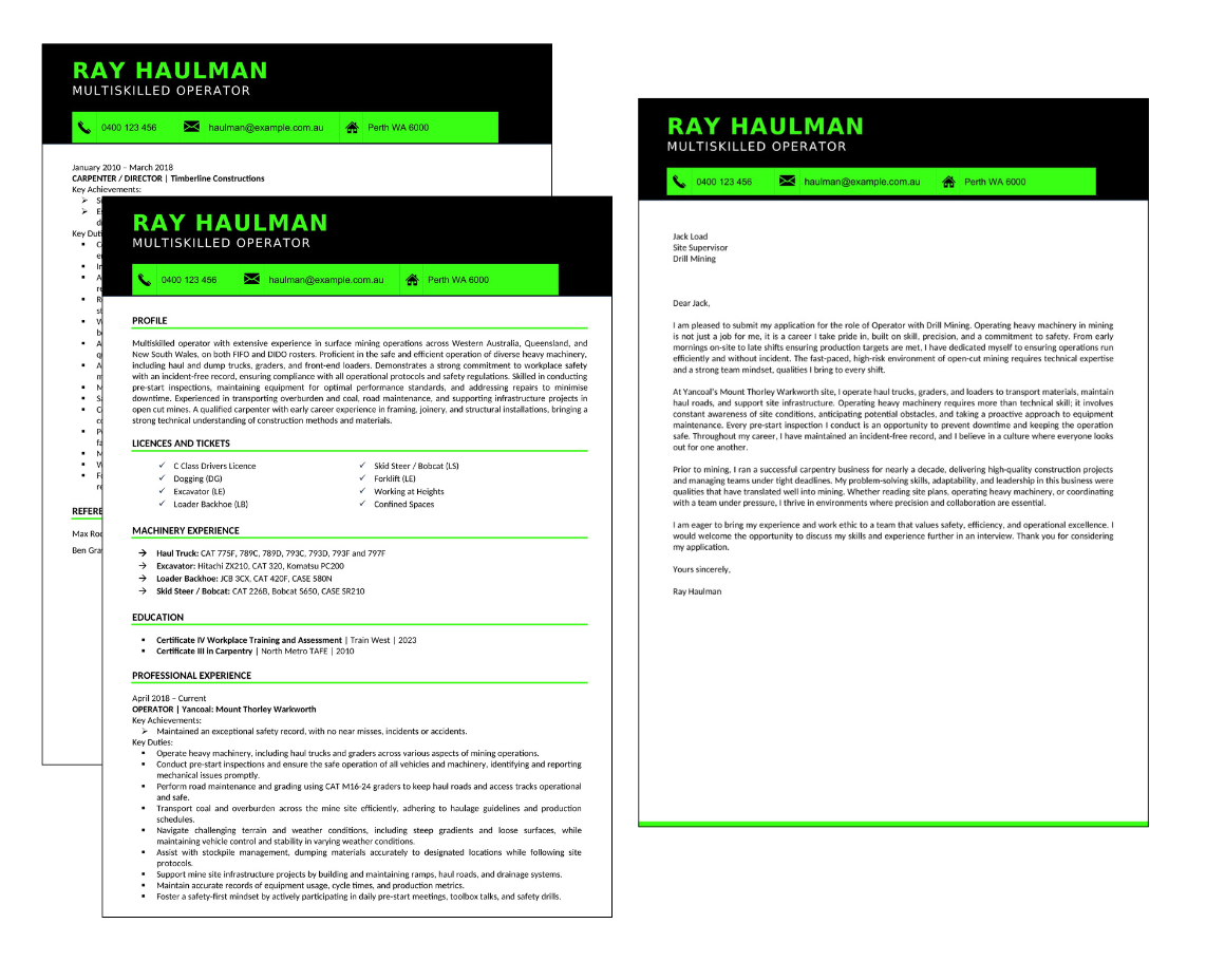 Mining resumes aren’t just about job titles, they need to tick boxes around safety, compliance, physical capability, and technical expertise. We know what recruiters and hiring managers expect to see, and we make sure your documents deliver. Below are examples of what’s commonly included in strong mining resumes: