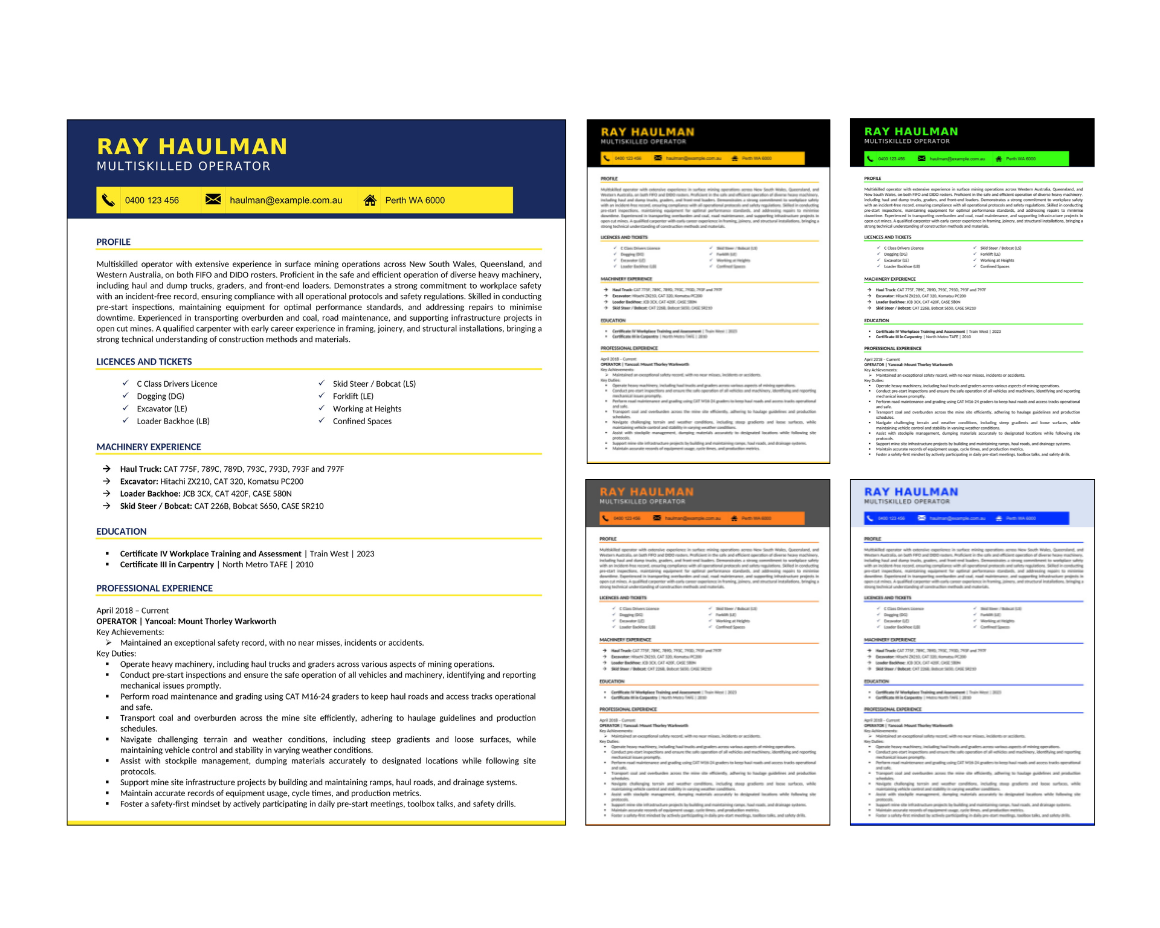 - Licences & Tickets: HR licence, EWP, working at heights, confined space, explosives handling, DG, RB, LE, LF, RI, RA, CO etc.
